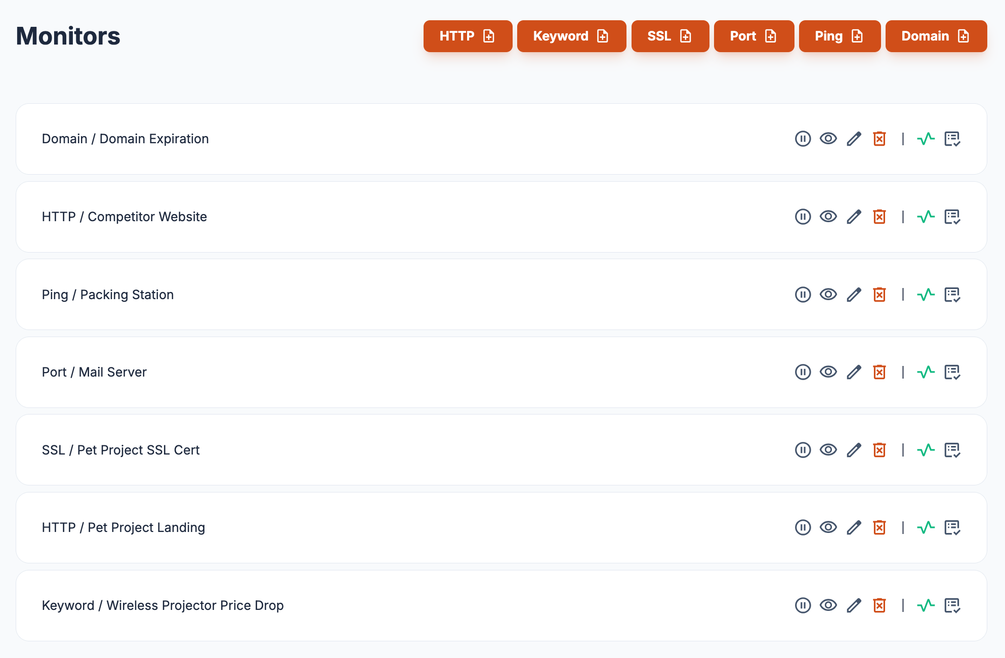 HTTP, SSL, keyword, port, ping, and domain — everything under one clean dashboard. No need to juggle different tools to understand what's happening.